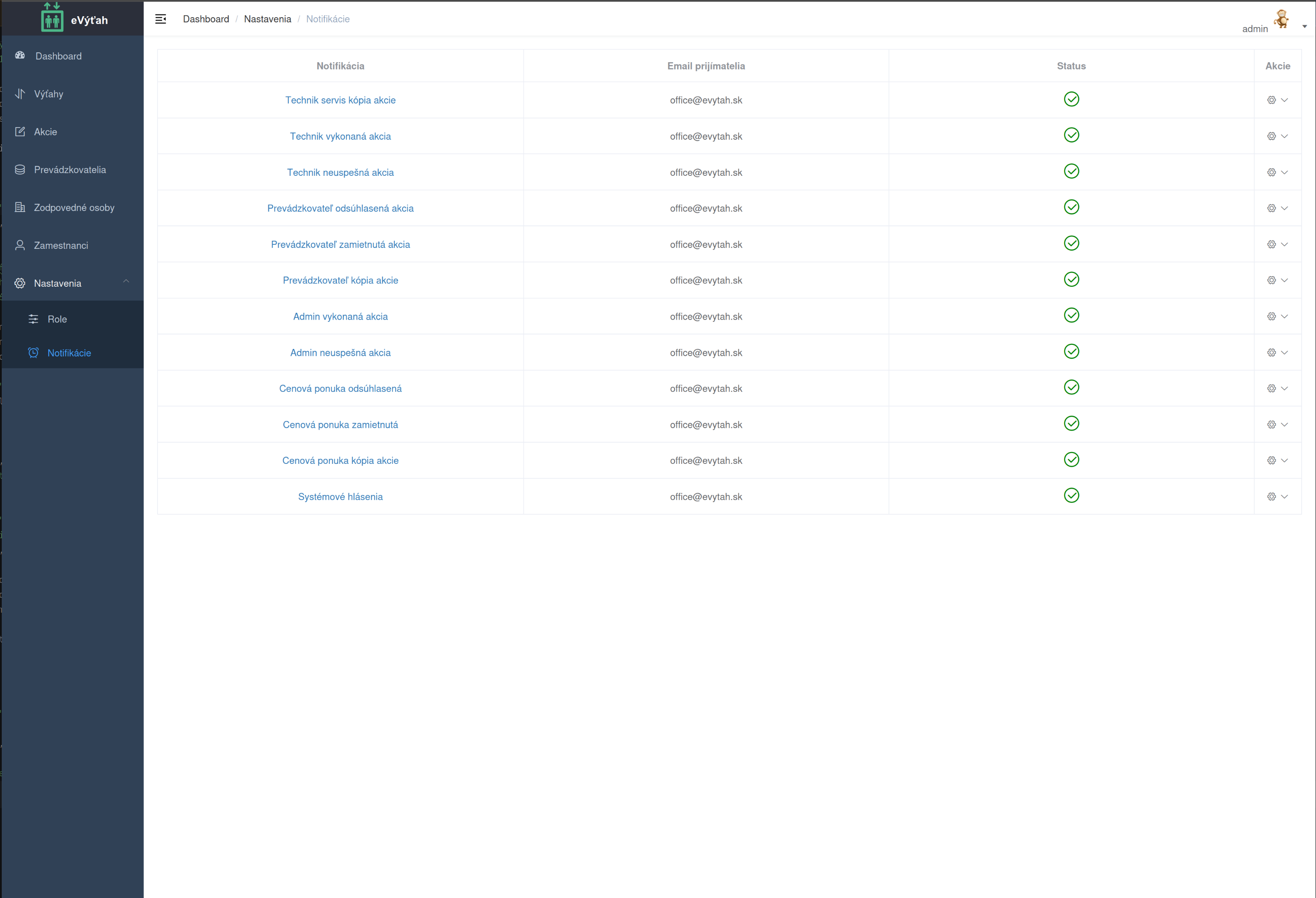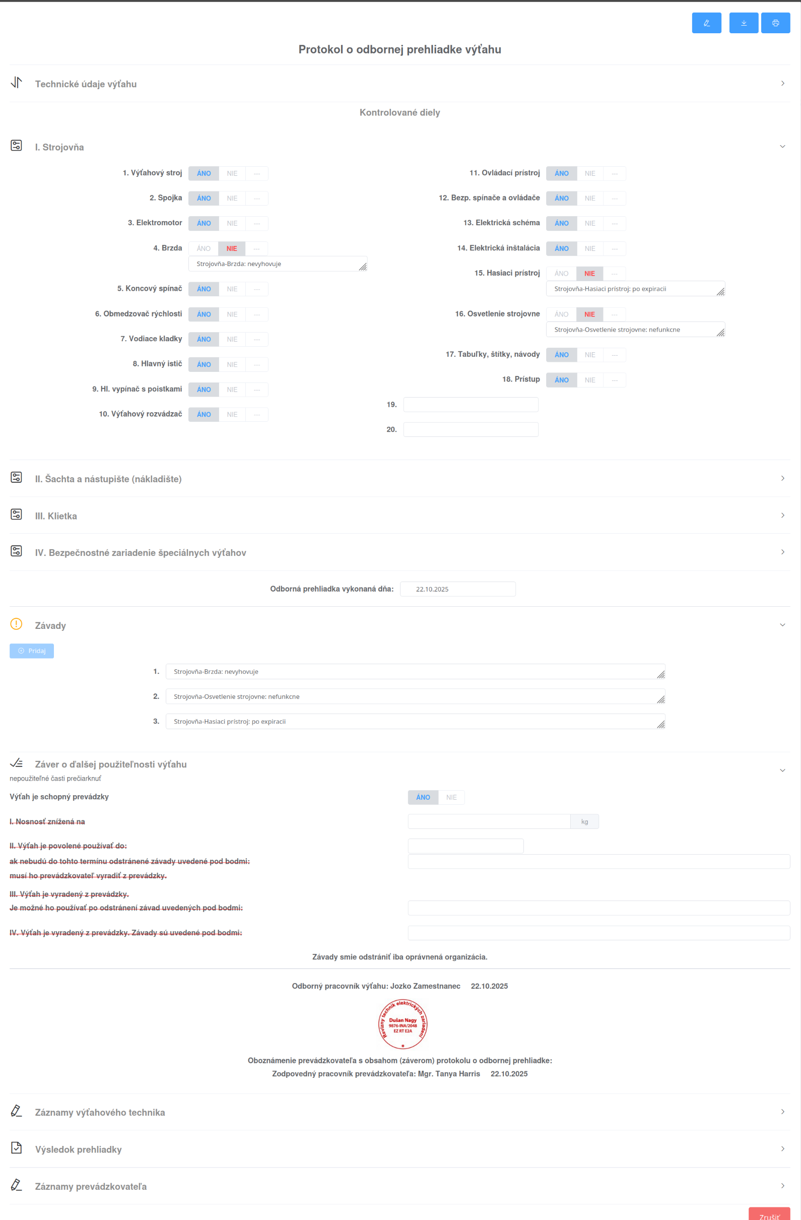 Správca výťahu revíziu odobrí alebo zamietne. Administrátor platformy je informovaný o rozhodnutí a systém umožní vytvorenie servisného zásahu alebo cenovej ponuky.