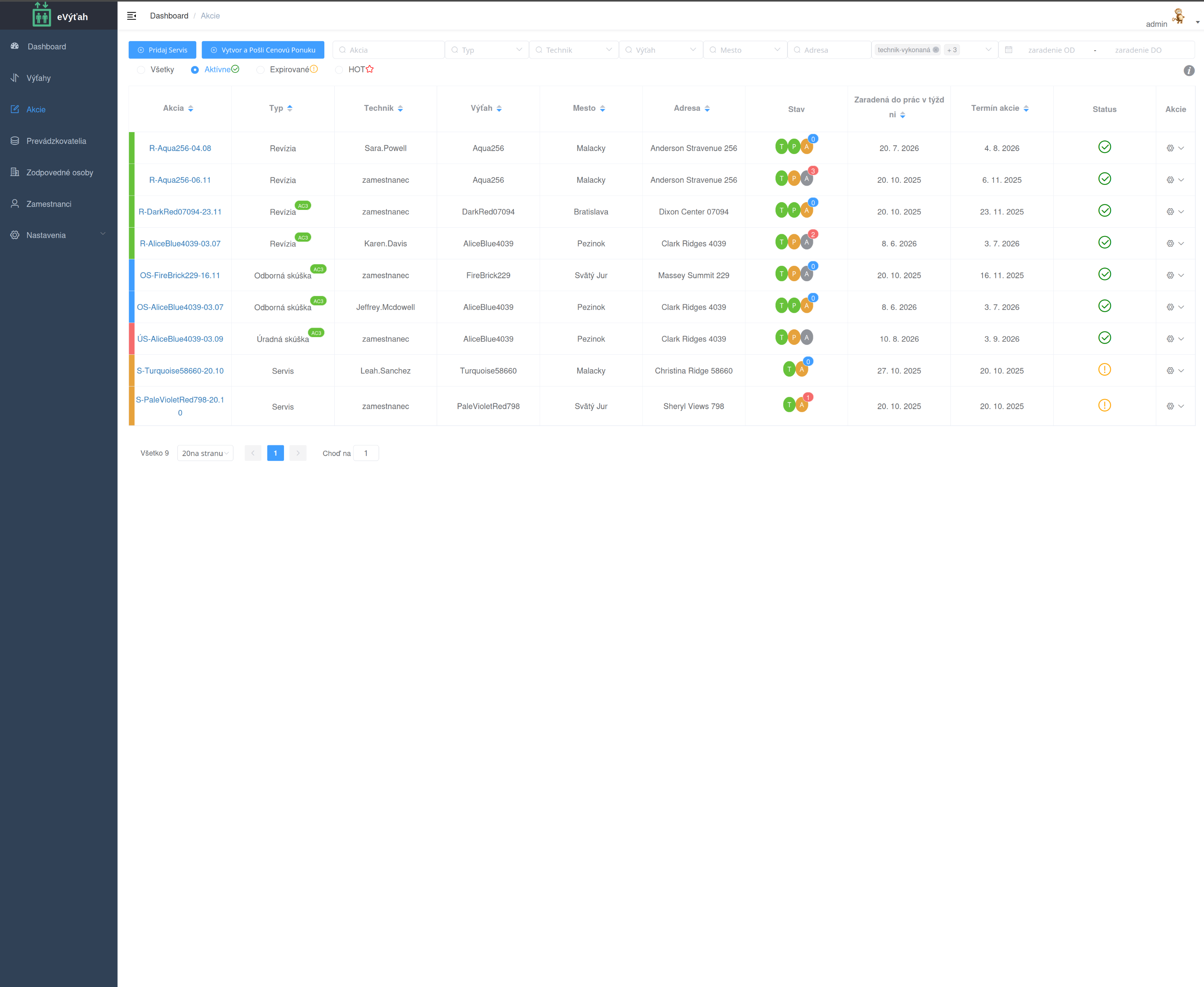 Technik vykonáva revíziu priamo v aplikácii s priebežným ukladaním. Administrátor platformy vidí výsledky a geolokáciu vykonania.