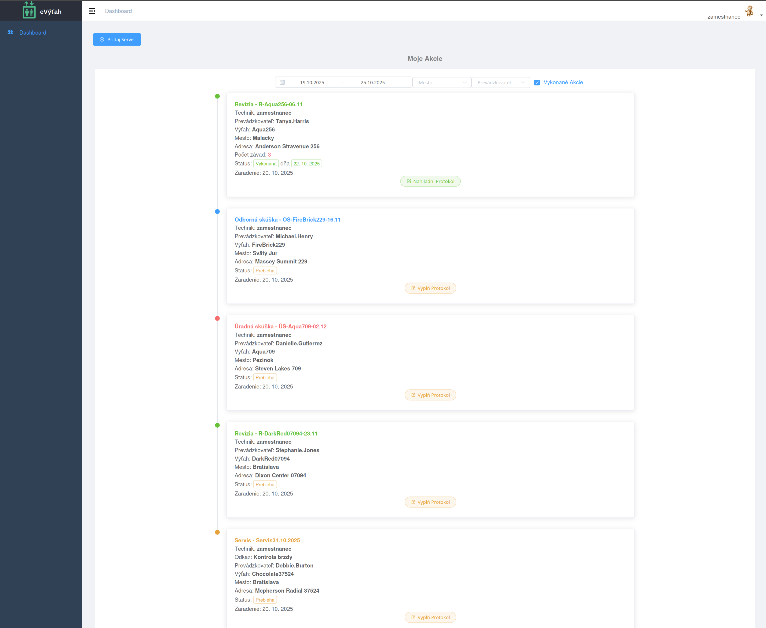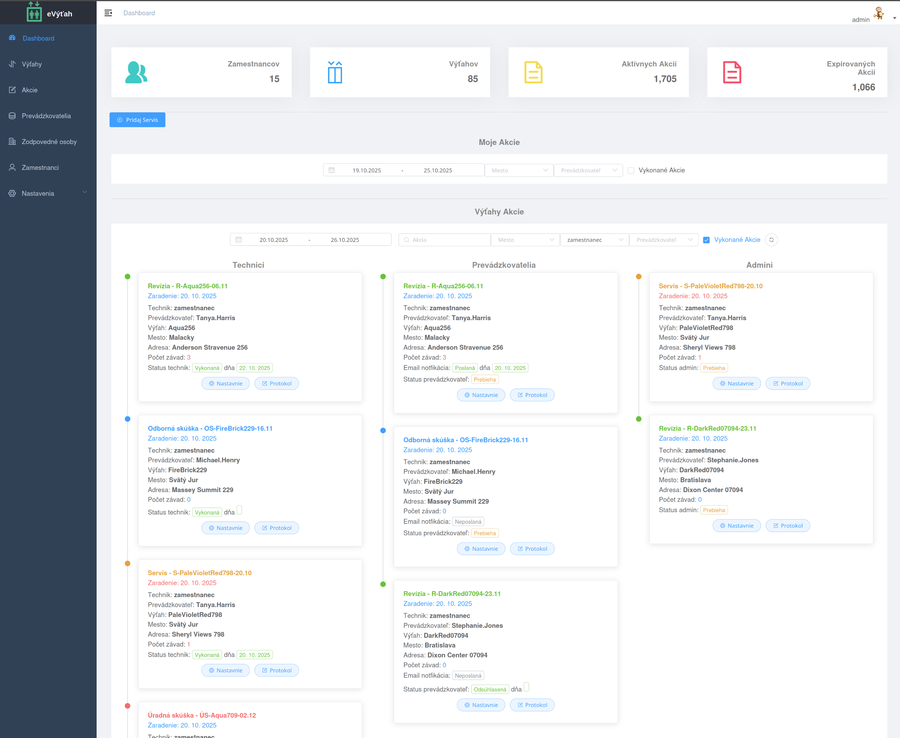 Systém sleduje revízne cykly (3 mesiace / 3 roky / 6 rokov) a posiela notifikácie technikovi aj administrátorovi platformy.