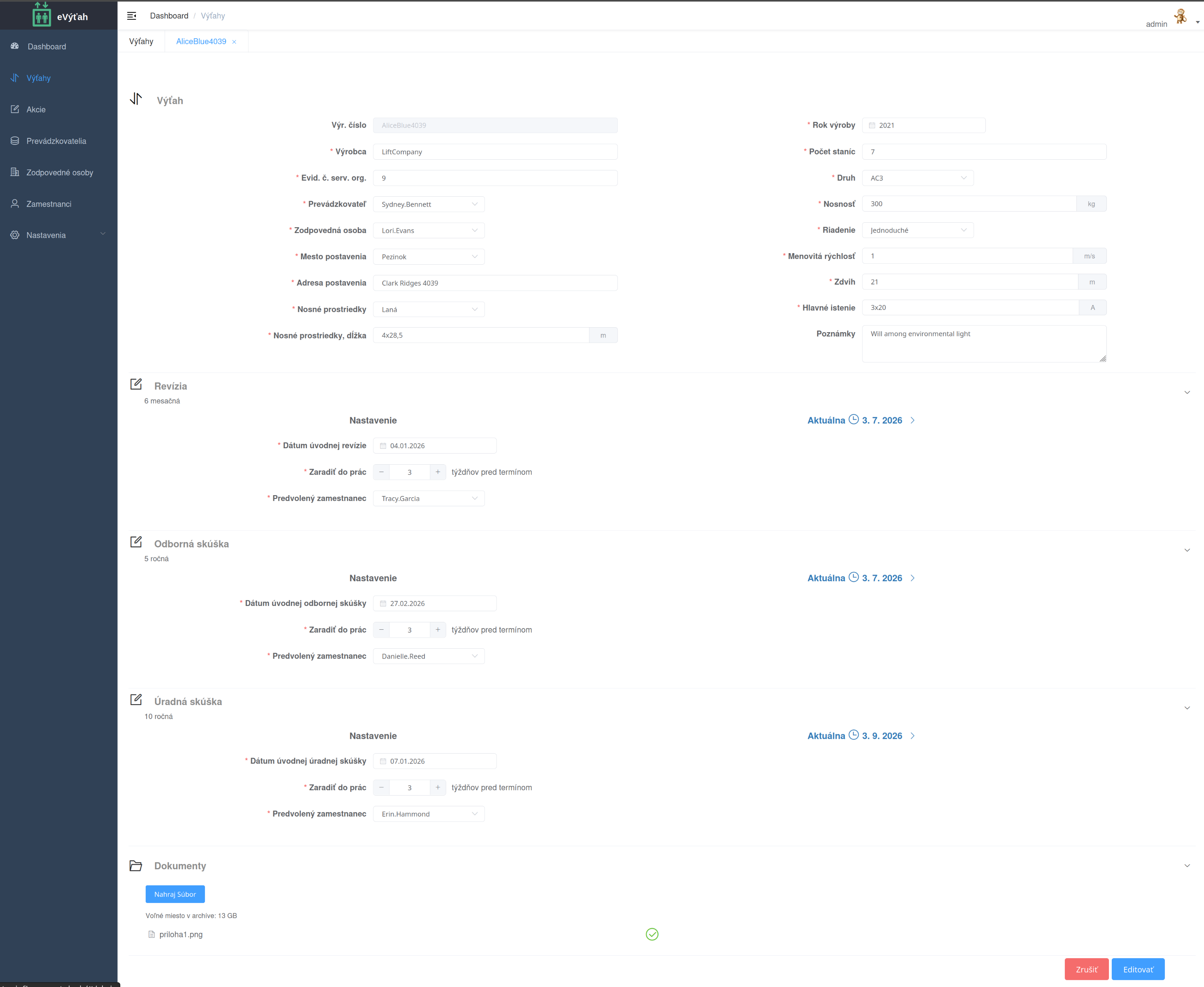 Online databáza všetkých výťahov, ich technických údajov a histórie revízií. Možnosť priložiť dokumentáciu, fotografie a certifikáty.