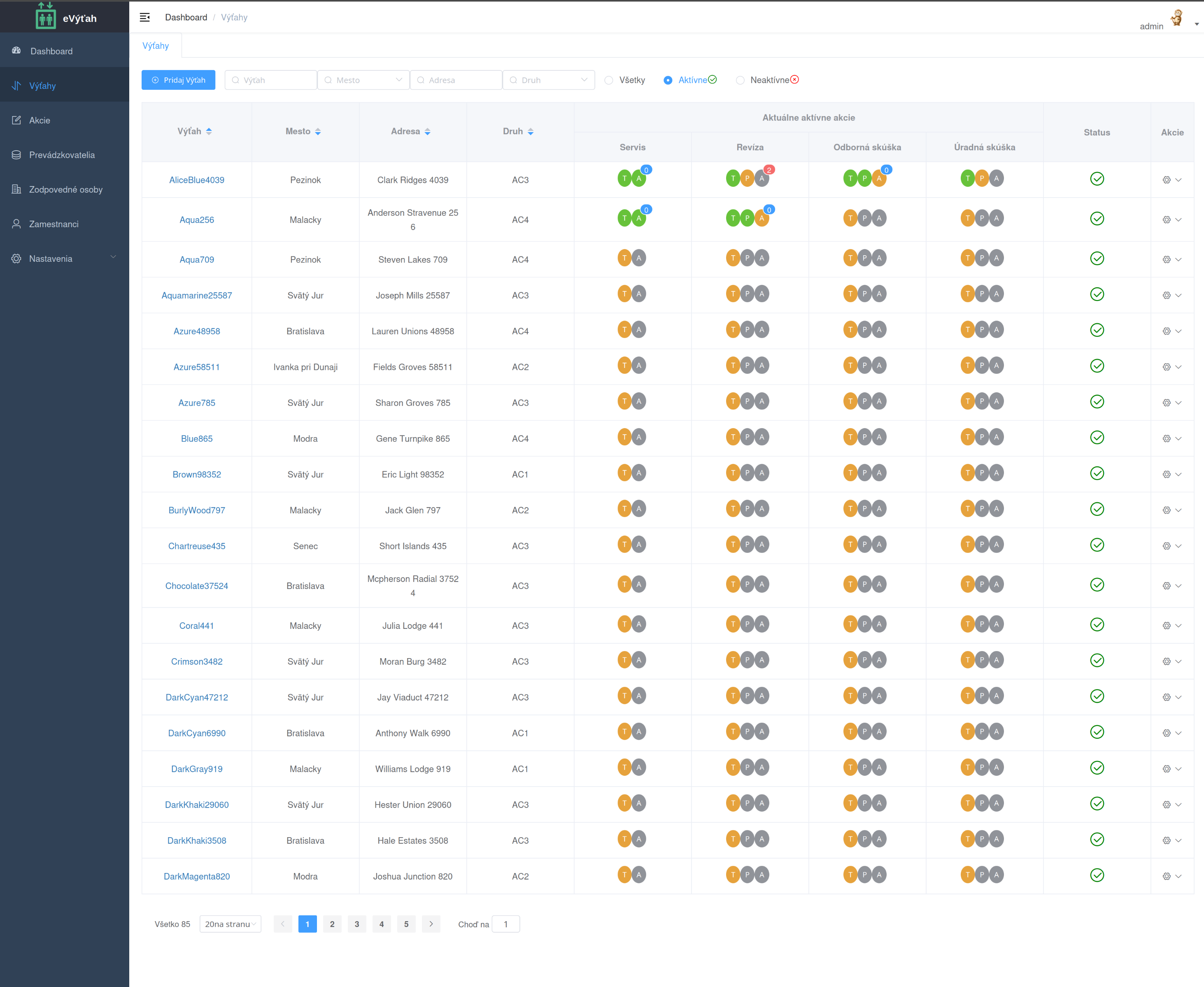 eVýťah je komplexný systém pre správu životného cyklu výťahov. Umožňuje výťahárským firmám evidovať výťahy, plánovať pravidelné revízie, odborné a úradné skúšky, priraďovať technikov a sledovať priebeh revízií v reálnom čase.